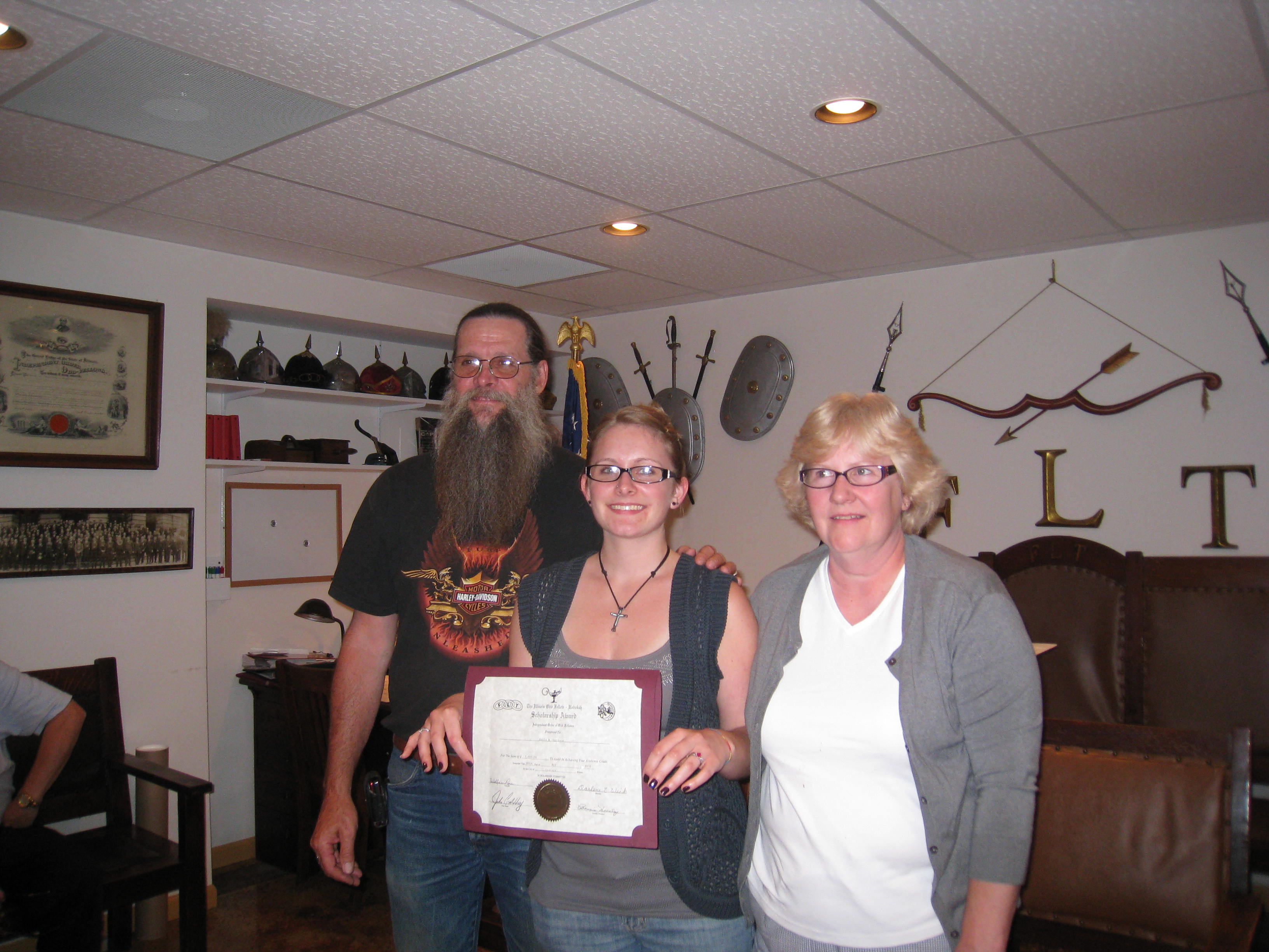 At the June 7th meeting of Rebekah Samaritan Lodge #120, Rebekah Kelly Gallois, a member of both Samaritan Lodge #120 and LEA #173, received a $1000 Scholarship from the Oddfellows and Rebekahs Scholarship Fund. Presenting this award were both of her parents, Noble Grand of Elgin Lodge #12 Matt Gallois, and Judy Gallois, Chaplain of the Samaritan Lodge #120. Both parents are proud of Kelly’s academic achievements. She will be attending Rush Univerisity in January 2011 as she continues her advanced education towards a Masters Degree in Nursing.